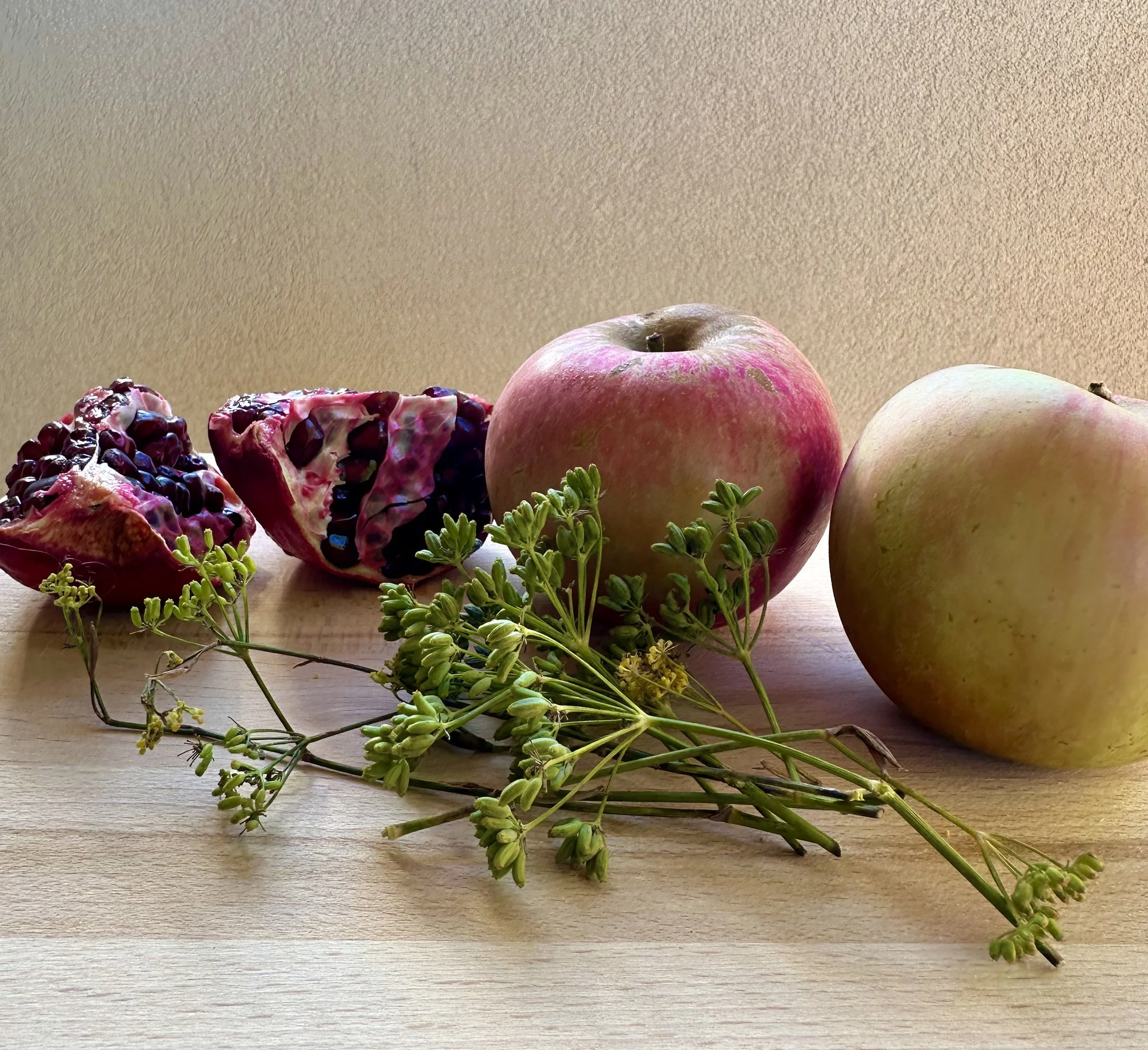 Add the peel from the apple to a cooking pot with the peel and pith from the pomegranate, the hawthorn berries, and the peel and pith and seeds from the lemon. Add the filtered water and lemon juice and bring the pot to a boil. Cover with a lid and simmer for 90 minutes. Add the apple pieces, pomegranate fruit, cinnamon and fennel seeds for a further 20-30 minutes of simmering before pushing the fruit paste through a strainer until you have a smooth puree.