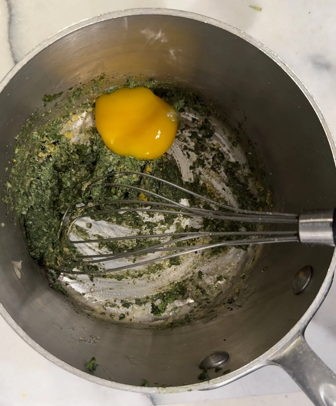 Rinse the stinging nettles well, and remove the nettle leaves from the stems. Dry the leaves and add them to a blender. Do the same with the garlic mustard, but keep and use the stems, as they are tender. Use a designated coffee grinder or blender to pulverize the leaves. Add this chopped mix to the roux and stir well. Stir in the egg yoke and nutritional yeast, and set this aside until after you have whisked the egg whites into white fluffy peaks!