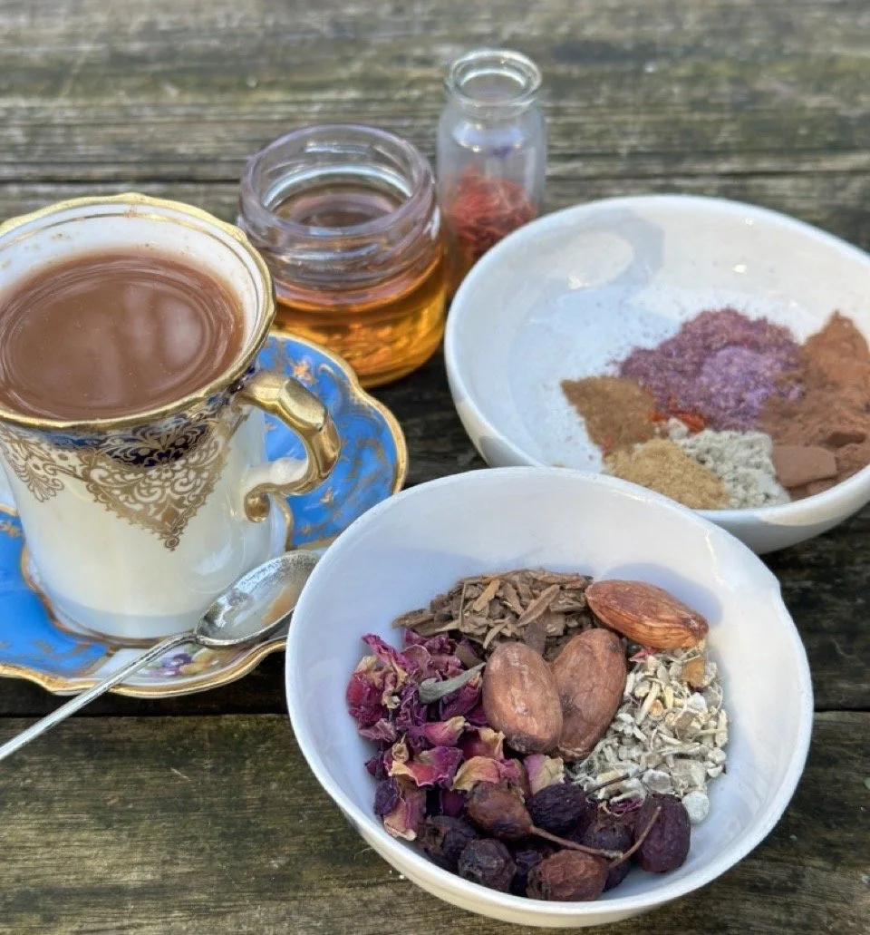 There are so many reasons why drinking hot chocolate with some heart friendly herbs, might be an appropriate fit for right now: It's cold outside, you need a cozy drink, February 14th is approaching, or because life's current intensity is a lot to handle, but the reasons why I love this demitasse treat is because it tastes decadent, lifts my spirits and is perfect for hydrating skin that might be dried out from the winter elements. It's creamy and chocolatey, as you would expect, but, there's no dairy, nut or oat milk in sight.