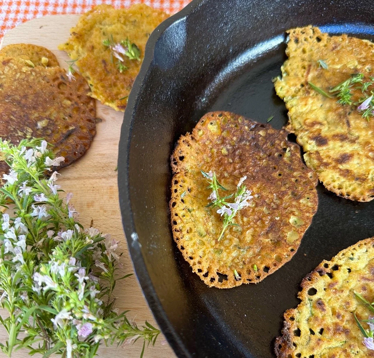 If you’ve never tried Socca, then prepare to make it your new favorite pancake. Traditionally, it’s made with chickpea flour, water, olive oil and salt and pepper and a hot skillet. I make some version of this pancake at least once a week, and today’s version has some grated zucchini and of course the savory I gathered.